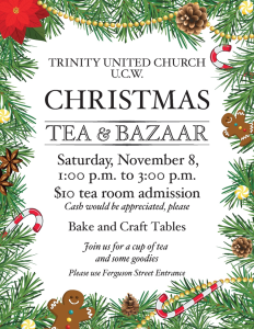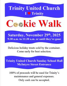 Hello Trinity Friends,It is a busy weekend at Trinity. Tomorrow the UCW is hosting their annual Christmas Tea and Bazaar from 1 – 3. Come enjoy afternoon tea complete with fancy finger sandwiches, delicious treats and coffee or tea served in beautiful formal tea cups. $10 per person. While you are there come browse the craft and snack tables to get a head start on your Christmas shopping! On Sunday, during our morning worship, we will be holding a Remembrance Service. Our piper is Rob Sanders and our trumpet is Marcel MacDonald. After the service, plan to come back to enjoy the JOY Band’s “Musical Memories of the War Years’ concert. The sing-a-long starts at 1:30 followed by the concert at 2 pm. Proceeds will go towards the Nipissing Serenity Hospice (in honour of Cindy Brownlee). The Sunday School will begin rehearsing for the Christmas Pageant beginning this Sunday. If your child would like to participate but will not be at church on Sunday, please be in touch with Lisa asap. What’s happening next week at TRINITY? Glad you asked – please keep reading! Youth Group Escape Room and GamesYouth in Grade 7 and up are invited to a friendly escape room challenge at Trinity church. Friends are always welcome. It takes place Friday November 14th (which happens to be a PD Day) from 12 – 3 pm. Lunch will be provided but you must RSVP to Lisa Blais or Marcel MacDonald. IMPORTANT INFORMATION MEETINGNEXT Sunday, Nov. 16: “Faith Forward” Congregational Information Session immediately following worship, in the sanctuary, then stay for a hotdog lunch before the Santa Claus parade. Speaking of the Santa Claus Parade (Sunday November 16) – did you know that the parade passes right by our Ferguson street entrance? Many of our church members stay for front row seating (we even pull out some comfy furniture). The Christian Education Committee will serve a hotdog lunch after church and hot chocolate during the parade. Hope to see you there! “HOUSE CONCERT” with IAN SHERWOODTrinity Arts and East Coaster Studios invites you to a limited seat ‘house concert type event in Trinity’s Fireside Room on Saturday November 15th at 6:30 pm. There are only 50 tickets available and they are only $20 a ticket! You can reserve your ticket through Trinity’s office.SONGWRITING WORKSHOP- Saturday November 15, here at Trinity. Gain some songwriting insights from Nova Scotia’sIan Sherwood. Cost- $50 adults, $40 students, and includes afternoon (12:30-4:30pm) workshop and admission to a solo show in the evening. Another East Coaster Studios event. To register, contact: eastcoasterstudios@gmail.com