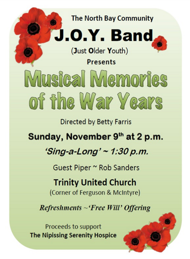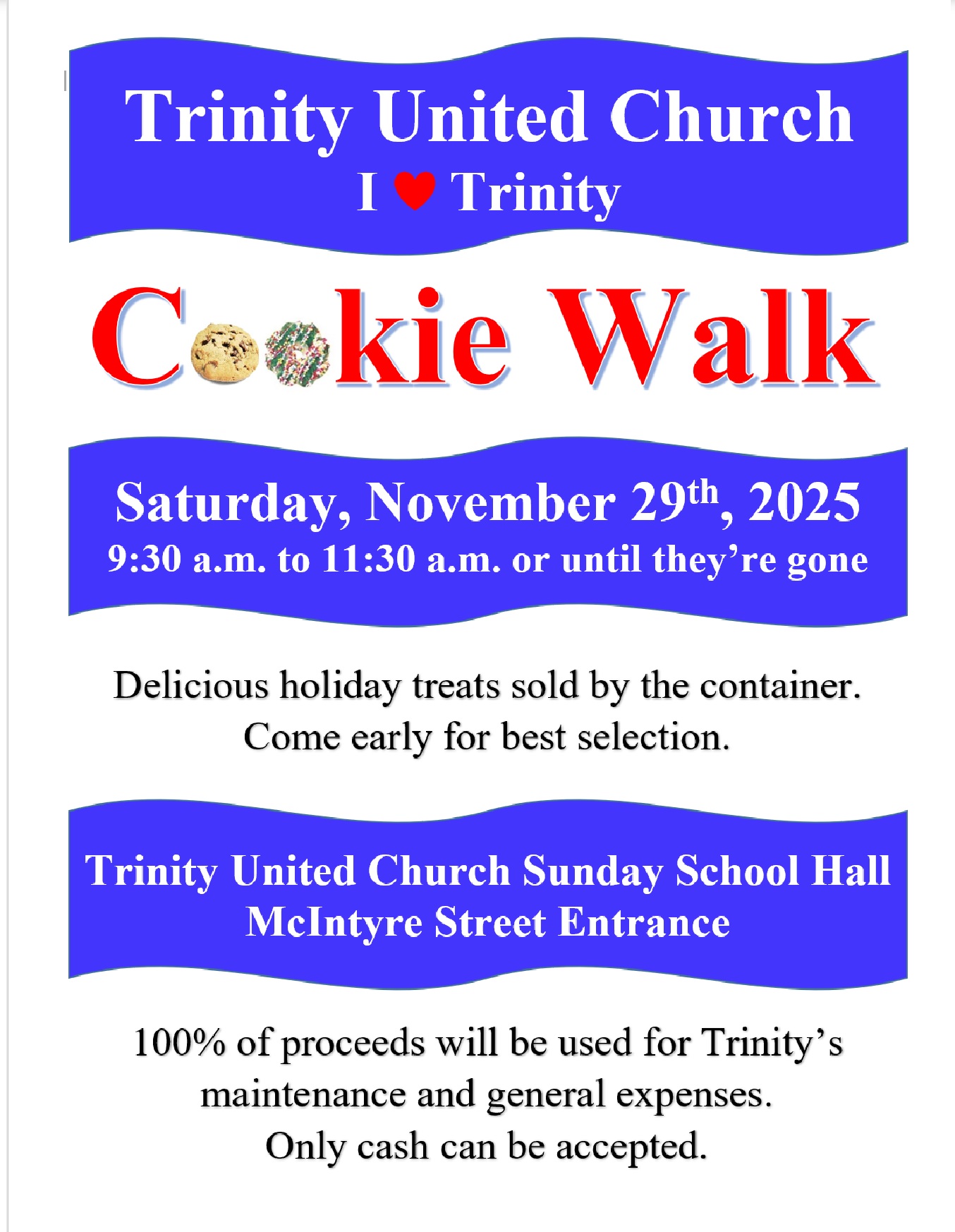 Hello Trinity Friends,It is a busy weekend at Trinity. Tomorrow the UCW is hosting their annual Christmas Tea and Bazaar from 1 – 3. Come enjoy afternoon tea complete with fancy finger sandwiches, delicious treats and coffee or tea served in beautiful formal tea cups. $10 per person. While you are there come browse the craft and snack tables to get a head start on your Christmas shopping! On Sunday, during our morning worship, we will be holding a Remembrance Service. Our piper is Rob Sanders and our trumpet is Marcel MacDonald. After the service, plan to come back to enjoy the JOY Band’s “Musical Memories of the War Years’ concert. The sing-a-long starts at 1:30 followed by the concert at 2 pm. Proceeds will go towards the Nipissing Serenity Hospice (in honour of Cindy Brownlee). The Sunday School will begin rehearsing for the Christmas Pageant beginning this Sunday. If your child would like to participate but will not be at church on Sunday, please be in touch with Lisa asap. What’s happening next week at TRINITY? Glad you asked – please keep reading! Youth Group Escape Room and GamesYouth in Grade 7 and up are invited to a friendly escape room challenge at Trinity church. Friends are always welcome. It takes place Friday November 14th (which happens to be a PD Day) from 12 – 3 pm. Lunch will be provided but you must RSVP to Lisa Blais or Marcel MacDonald. IMPORTANT INFORMATION MEETINGNEXT Sunday, Nov. 16: “Faith Forward” Congregational Information Session immediately following worship, in the sanctuary, then stay for a hotdog lunch before the Santa Claus parade. Speaking of the Santa Claus Parade (Sunday November 16) – did you know that the parade passes right by our Ferguson street entrance? Many of our church members stay for front row seating (we even pull out some comfy furniture). The Christian Education Committee will serve a hotdog lunch after church and hot chocolate during the parade. Hope to see you there! “HOUSE CONCERT” with IAN SHERWOODTrinity Arts and East Coaster Studios invites you to a limited seat ‘house concert type event in Trinity’s Fireside Room on Saturday November 15th at 6:30 pm. There are only 50 tickets available and they are only $20 a ticket! You can reserve your ticket through Trinity’s office.SONGWRITING WORKSHOP- Saturday November 15, here at Trinity. Gain some songwriting insights from Nova Scotia’sIan Sherwood. Cost- $50 adults, $40 students, and includes afternoon (12:30-4:30pm) workshop and admission to a solo show in the evening. Another East Coaster Studios event. To register, contact: eastcoasterstudios@gmail.com